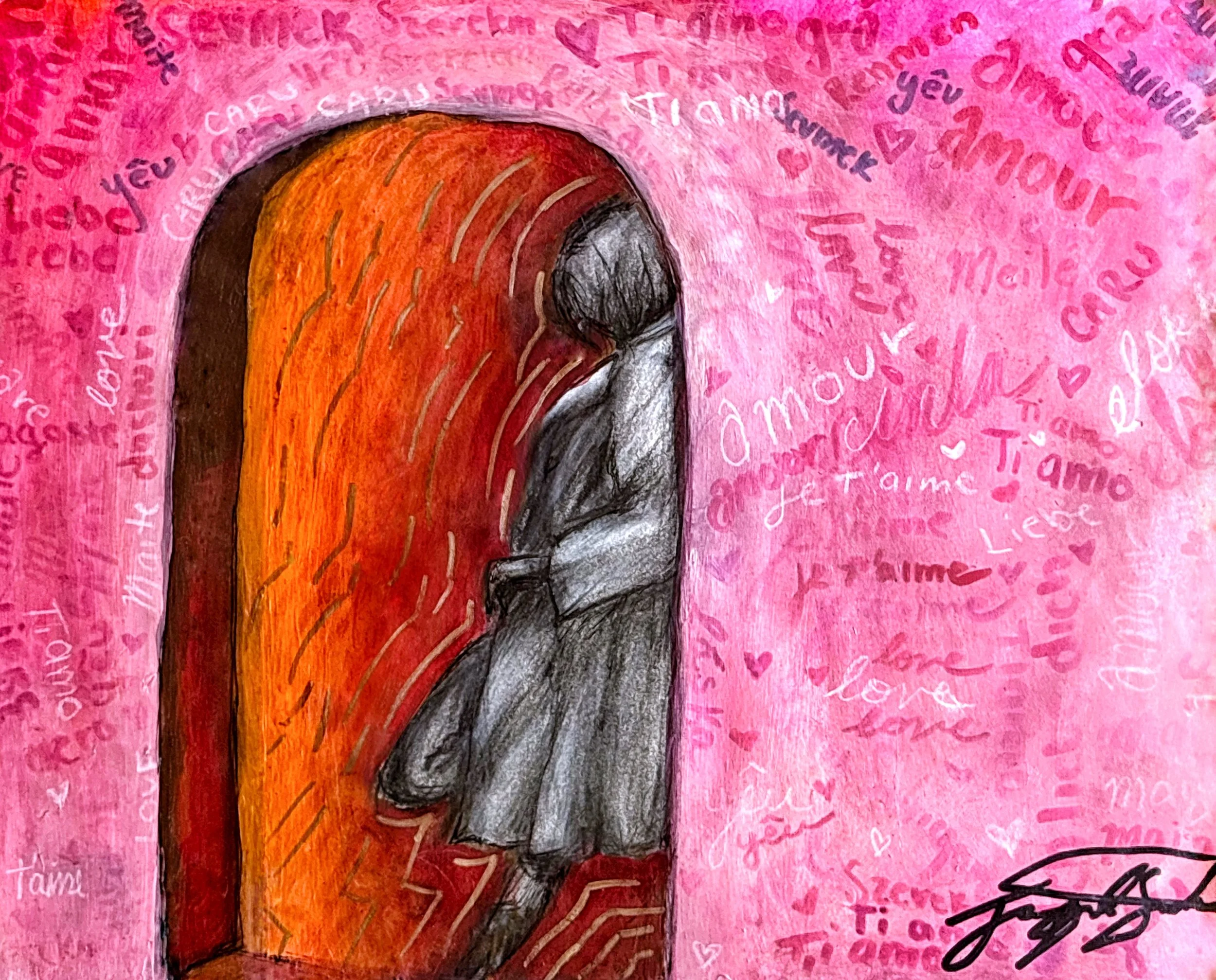 Parisian Mystique is a fashion-inspired drawing featuring a mysterious figure in a flowing trench coat. Pink and black mixed media creates an atmospheric portrait with French romantic undertones.