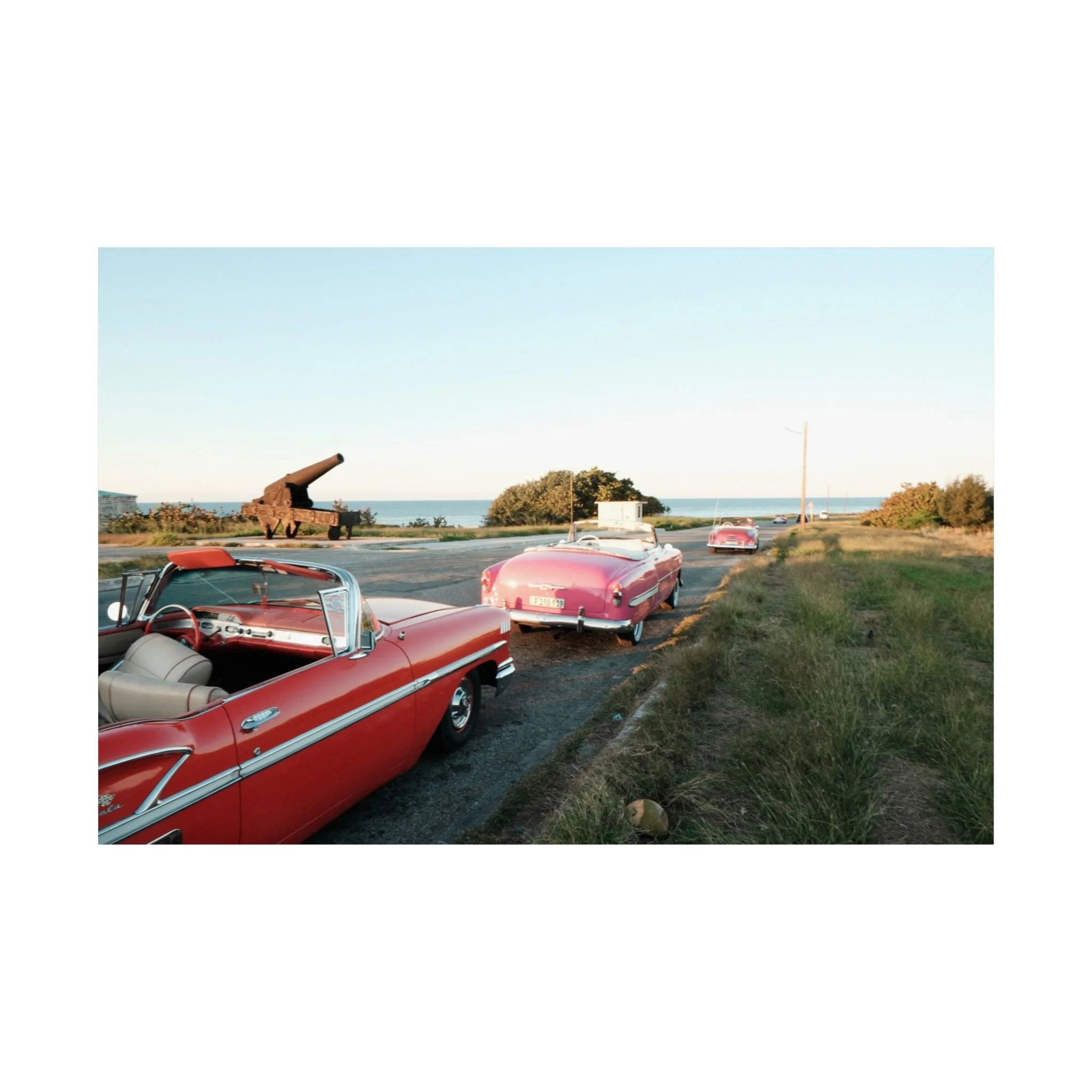 Three vintage Cuban convertibles line a coastal road at golden hour — red, pink, red — an old cannon standing guard as the Caribbean Sea stretches out behind them. This original fine art photograph captures the freedom, beauty and timeless romance of Cuba in one extraordinary frame, printed on premium archival matte paper.